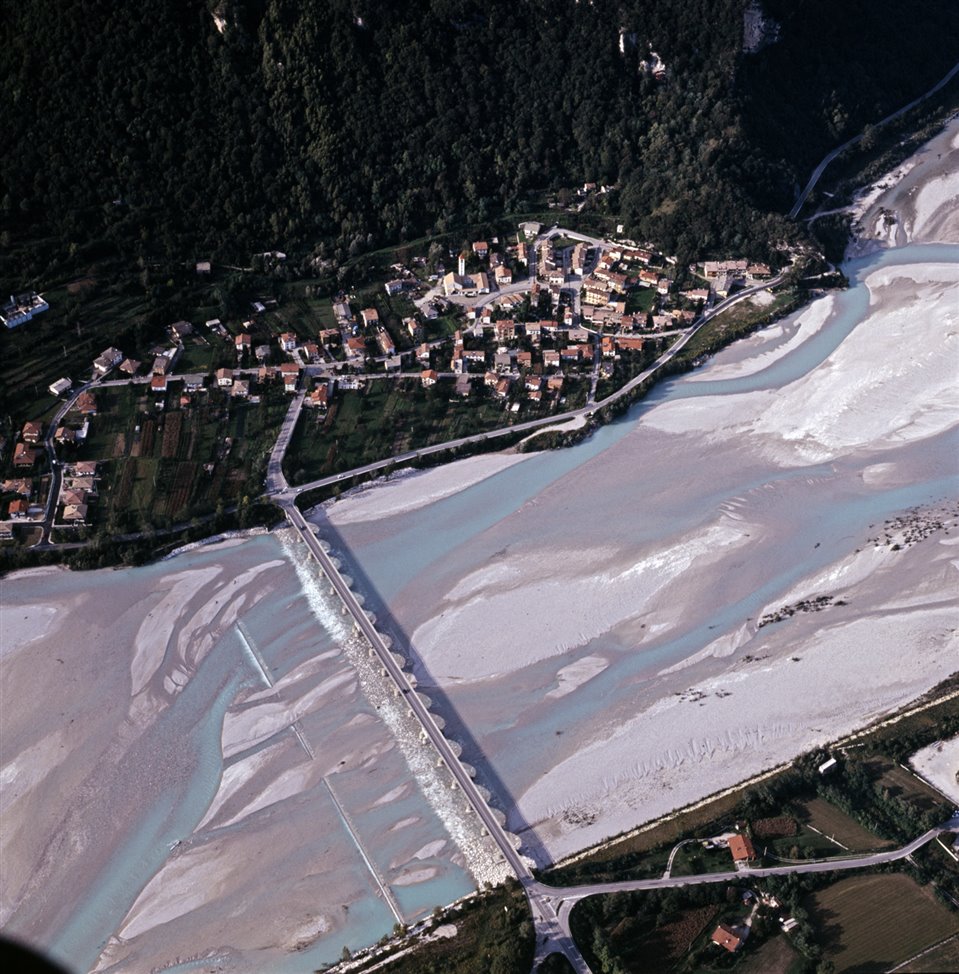 Veduta aerea della frazione di Braulins nel comune di Trasaghis con la chiesa di San Michele Arcangelo e il ponte sul fiume Tagliamento |