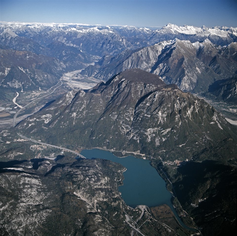 Veduta aerea della Alpi Carniche con il Monte San Simeone in primo piano, il lago di Cavazzo, l’autostrada A23 Palmanova-Tarvisio e il fiume Tagliamento |