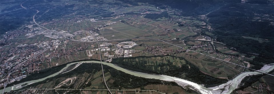 Veduta aerea di parte della città di Gorizia con il fiume Isonzo, il ponte VIII Agosto, la traversa (Diga) di Gorizia, il ponte dell’autostrada Villesse-Gorizia e l’aeroporto di Gorizia “Amedeo Duca d’Aosta” (in località Merna) |