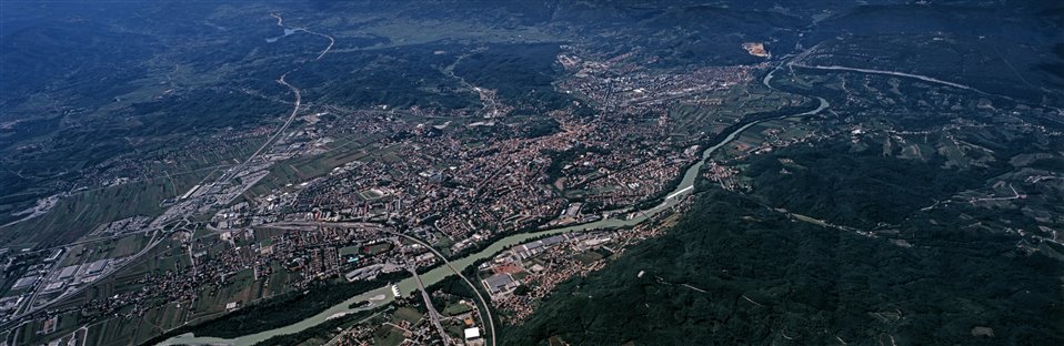 Veduta aerea della città di Gorizia con il fiume Isonzo, il ponte VIII Agosto, il viadotto “Ragazzi del ‘99”, il ponte ferroviario e la traversa (Diga) di Gorizia |