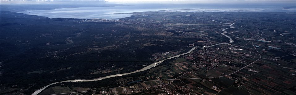 Veduta aerea dell’abitato di Gradisca d’Isonzo al centro, del fiume Isonzo e sullo sfondo il golfo di Panzano |