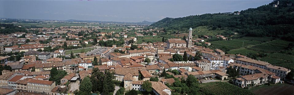 Veduta aerea dell’abitato di Cormòns, la chiesa di Sant’Adalberto (Duomo) e il Monte Quarin |