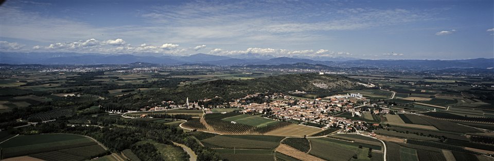 Veduta aerea dell’abitato di Medea, la chiesa di Santa Maria Assunta e il colle di Medea |