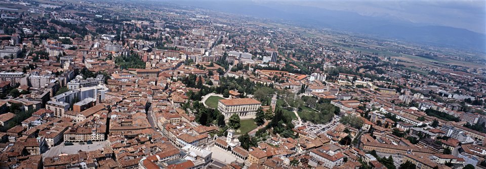 Veduta aerea di parte del centro storico di Udine con la Loggia del Lionello, la Torre dell’Orologio, piazza della Libertà, il Castello di Udine, la chiesa di Santa Maria di Castello, piazza Primo Maggio e il Giardin Grande. Sulla sinistra di piazza San Giacomo |