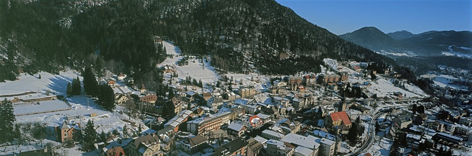 Veduta aerea dell’abitato di Tarvisio con la chiesa dei Santi Pietro e Paolo Apostoli e l’ex linea ferroviaria Udine-Tarvisio |