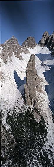 Veduta aerea di parte delle Prealpi Carniche con il Campanile di Val Montanaia |