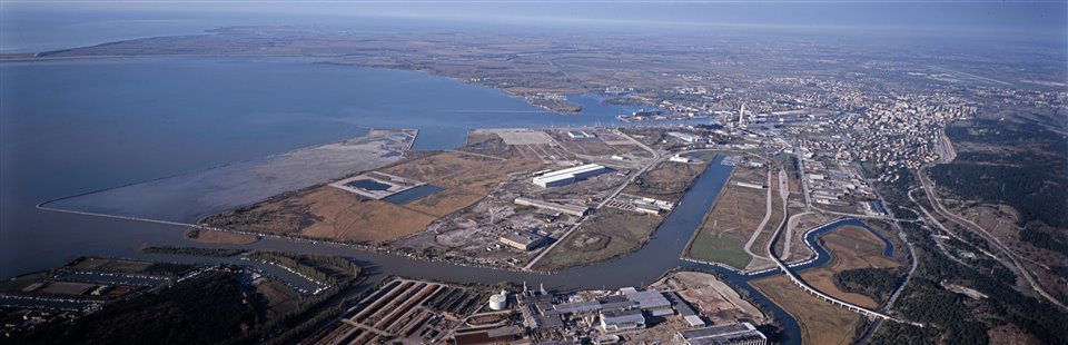 Veduta aerea della zona industriale del Lisert, il canale di Sablici, il golfo di Panzano e sulla destra la città di Monfalcone. In primo piano la cartiera Burgo |