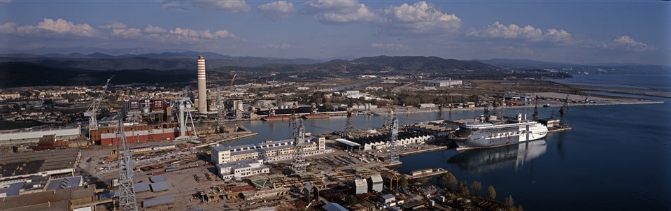 Veduta aerea di parte dello stabilimento Fincantieri – Cantiere Navale di Monfalcone con la centrale elettrica A2A. Sullo sfondo il Carso |