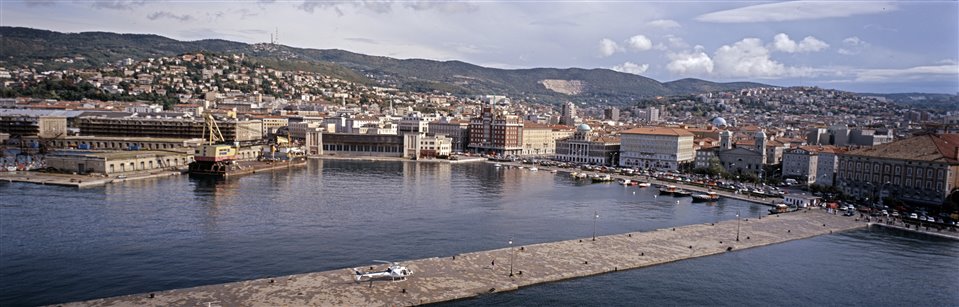 Veduta aerea del Molo Audace con Riva Tre Novembre e la chiesa greco-ortodossa. Sullo sfondo il Carso |
