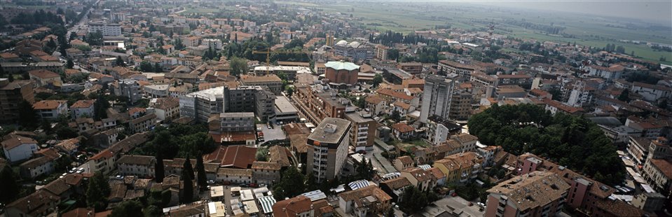 Veduta aerea della città di Cervignano del Friuli con al centro la chiesa di San Michele Arcangelo |