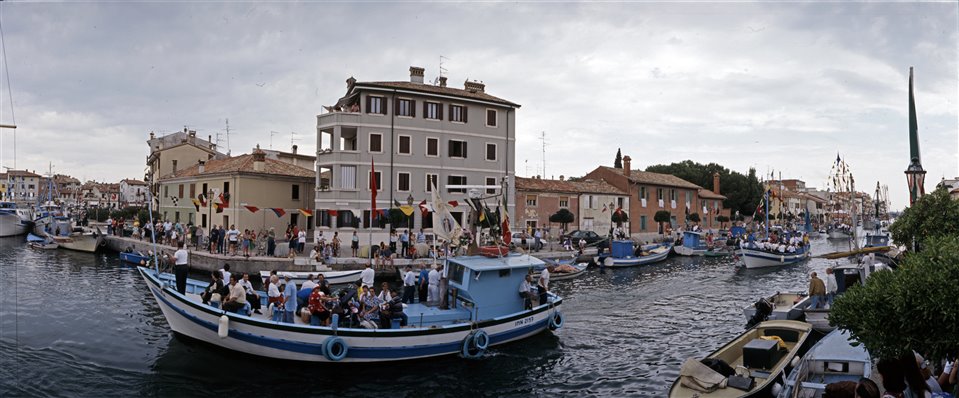 Un tratto del canale del porto con imbarcazioni decorate per la processione del Perdon di Barbana |