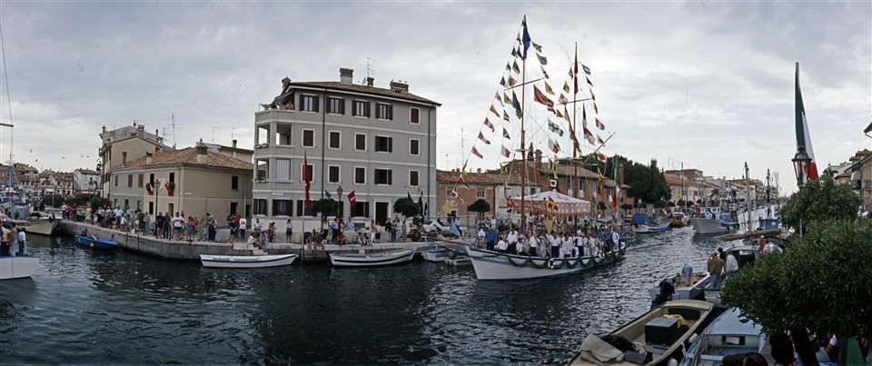 Un tratto del canale del porto con imbarcazioni decorate per la processione del Perdon di Barbana |