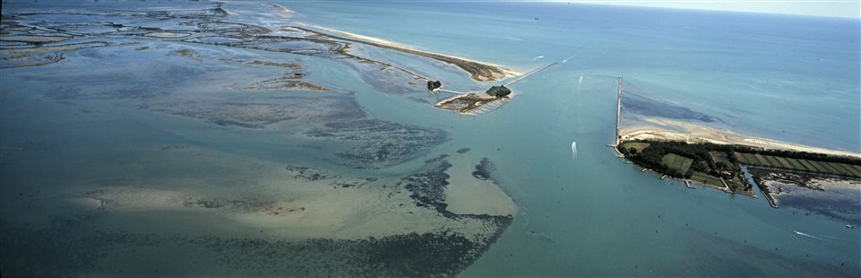 Veduta aerea della laguna di Grado di ponente con sulla sinistra Porto Buso, località Anfora e al centro il canale di Porto Buso |