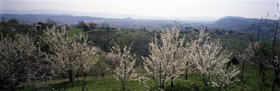 Ciliegi in fiore nella frazione di Oslavia nel comune di Gorizia; sullo sfondo la chiesa di San Mauro e il Monte Sabotino |