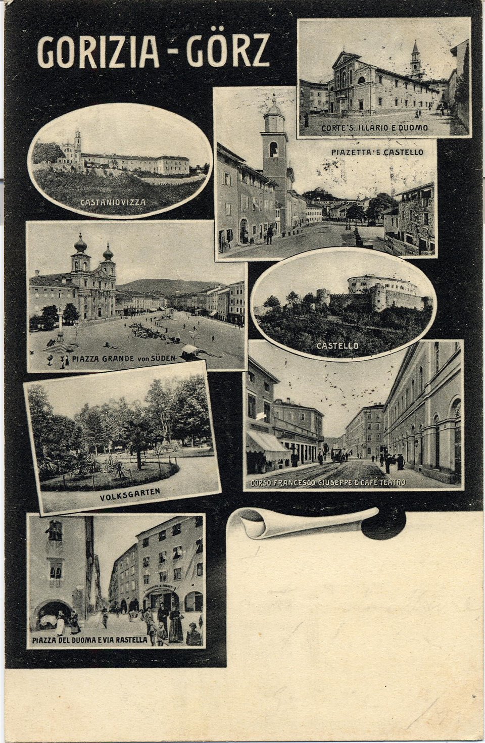| NOTE | Otto cornici di forma rettangolare e ovale lievemente sovrapposte racchiudono altrettante vedute di Gorizia: “Corte S. Illario e Duomo”, “Castaniovizza”, “Piazetta e Castello”, “Piazza Grande von Süden”, “Castello”, “Volksgarten”, “Corso Francesco Giuseppe e Café Teatro”, “Piazza del duoma e via Rastella”. Sul verso: “1905 Stengel & Co Dresden 35019”. Cartolina viaggiata. |