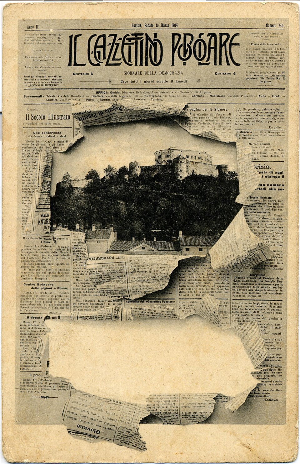 | NOTE | Una veduta del castello di Gorizia attraverso uno squarcio nella pagina del giornale “Il Gazzettino Popolare” del 19 marzo 1904, è l’insolita composizione di questa cartolina. Sul verso “S. D. M. 2334” Cartolina non viaggiata. |