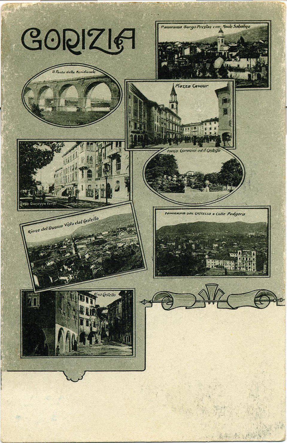 | SOGGETTO | GORIZIA – VEDUTA PANORAMICA -PONTE FERROVIARIO BORGO PIAZZUTTA - PIAZZA CAVOUR (GIÀ PIAZZA DEL DUOMO) - CORSO GIUSEPPE VERDI (GIÀ VIA DEL GIARDINO) – CASTELLO - VIALE XX SETTEMBRE (GIÀ VIA PONTE NUOVO) - PARCO CORONINI - PIAZZA DELLA VITTORIA (GIÀ PIAZZA GRANDE) – VEDUTINE |