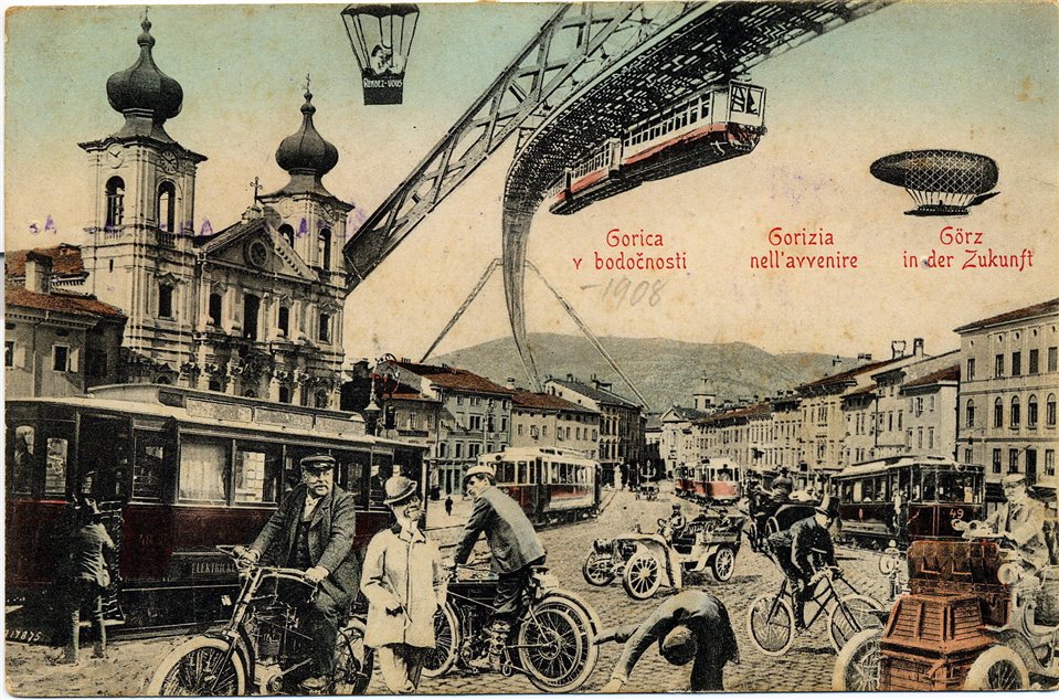 | NOTE | "Avveniristici" mezzi di trasporto in piazza Grande, ora piazza Vittoria. Sul verso: “A. Gabršček, Gorica.” |