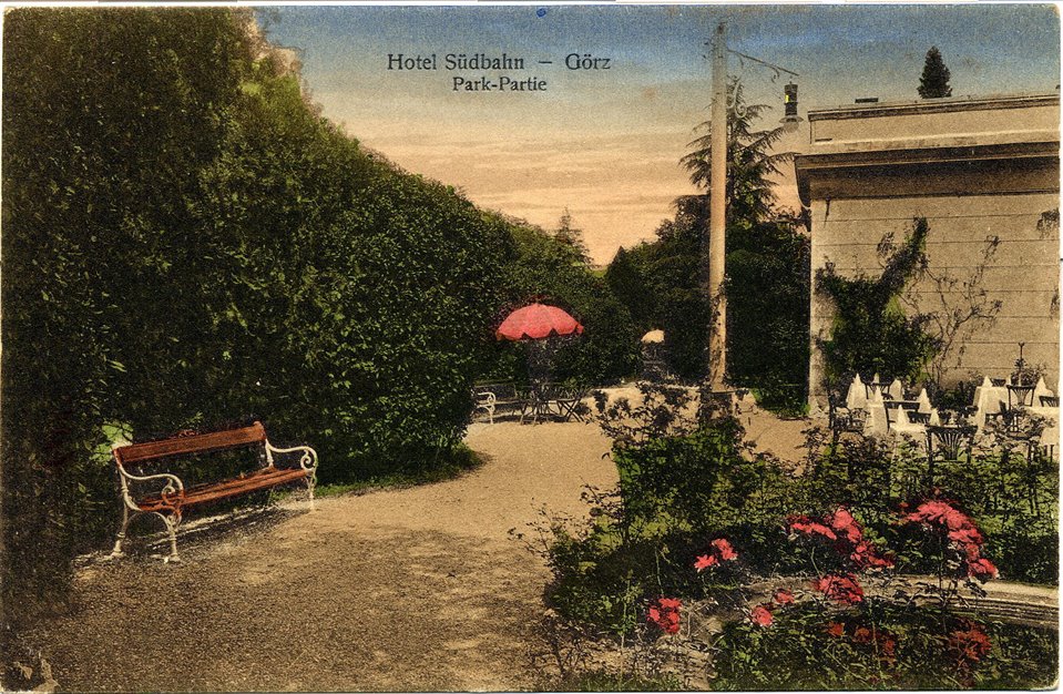 | NOTE | La cartolina illustra il lussureggiante parco dell’Hotel della Ferrovia Meridionale (Südbahnhotel) in piazza della Ginnastica, oggi Piazza Cesare Battisti. L’ottocentesco edificio venne adibito a hotel di lusso a partire dal 1890 e fino alla primavera del 1916. Al termine del primo conflitto mondiale, evento che lo danneggiò molto gravemente, venne adattato a caserma. Sul verso: “Haus Ranger Zentrale ruhige Lage. J. Szalay, Hotelier”; “Atelier Mazucco – Görz”; “F 4324 13”. Cartolina non viaggiata. |