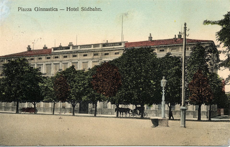 | NOTE | Il lussuoso Hotel della Ferrovia Meridionale (Südbahnhotel) aveva sede nell’ottocentesco edificio acquistato a tale scopo dall’imprenditore Gunkel nel 1890. Alla fine del primo conflitto mondiale, evento che lo danneggiò molto gravemente, venne adattato a caserma. Piazza Ginnastica è l'attuale piazza Cesare Battisti. Sul verso: “W. L. Bp.”; “27720 d” Cartolina viaggiata. |