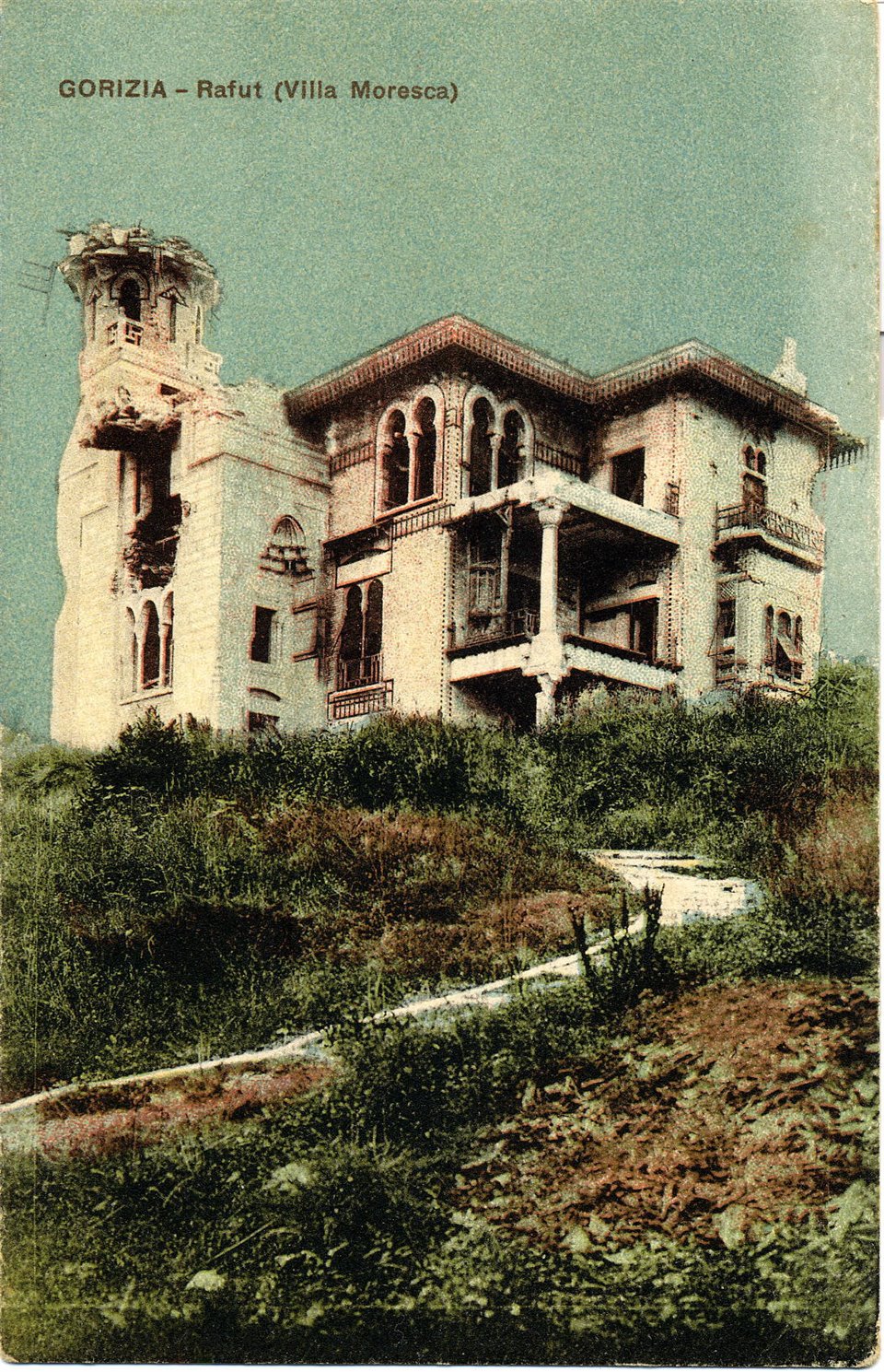 | NOTE | Villa Moresca venne progettata dall’architetto goriziano Antonio Lasciac (1856-1946) che incontrò notevole successo professionale in Egitto; qui realizzò numerosi progetti che gli valsero ambiti riconoscimenti e il titolo prestigioso di bey. L’edificio, L’edificio, costruito sul colle Rafut ora in territorio sloveno, venne ultimato nel 1914 e subì pesanti danneggiamenti durante la prima guerra mondiale documentati nella cartolina. Ripristinato, non venne risparmiato nel secondo conflitto mondiale a cui seguì una ristrutturazione non fedele all'aspetto originario. Sul verso: “1-4119” Cartolina non viaggiata. |
