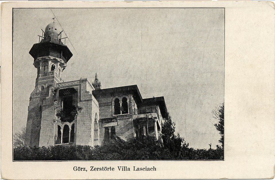 | NOTE | La villa, denominata anche 'Moresca' venne progettata dall’architetto goriziano Antonio Lasciac (1856-1946) che ebbe notevole successo professionale in Egitto; qui realizzò numerosi progetti che gli valsero ambiti riconoscimenti e il titolo prestigioso di bey. L’edificio, eretto nel 1909 sul colle Rafut ora in territorio sloveno, subì pesanti danneggiamenti durante il primo conflitto mondiale documentati dalla cartolina. Sul verso: "Verlag Kartonnagen - Fabrik Pertot, Görz"; "A. P. G. 1917". Cartolina non viaggiata. |