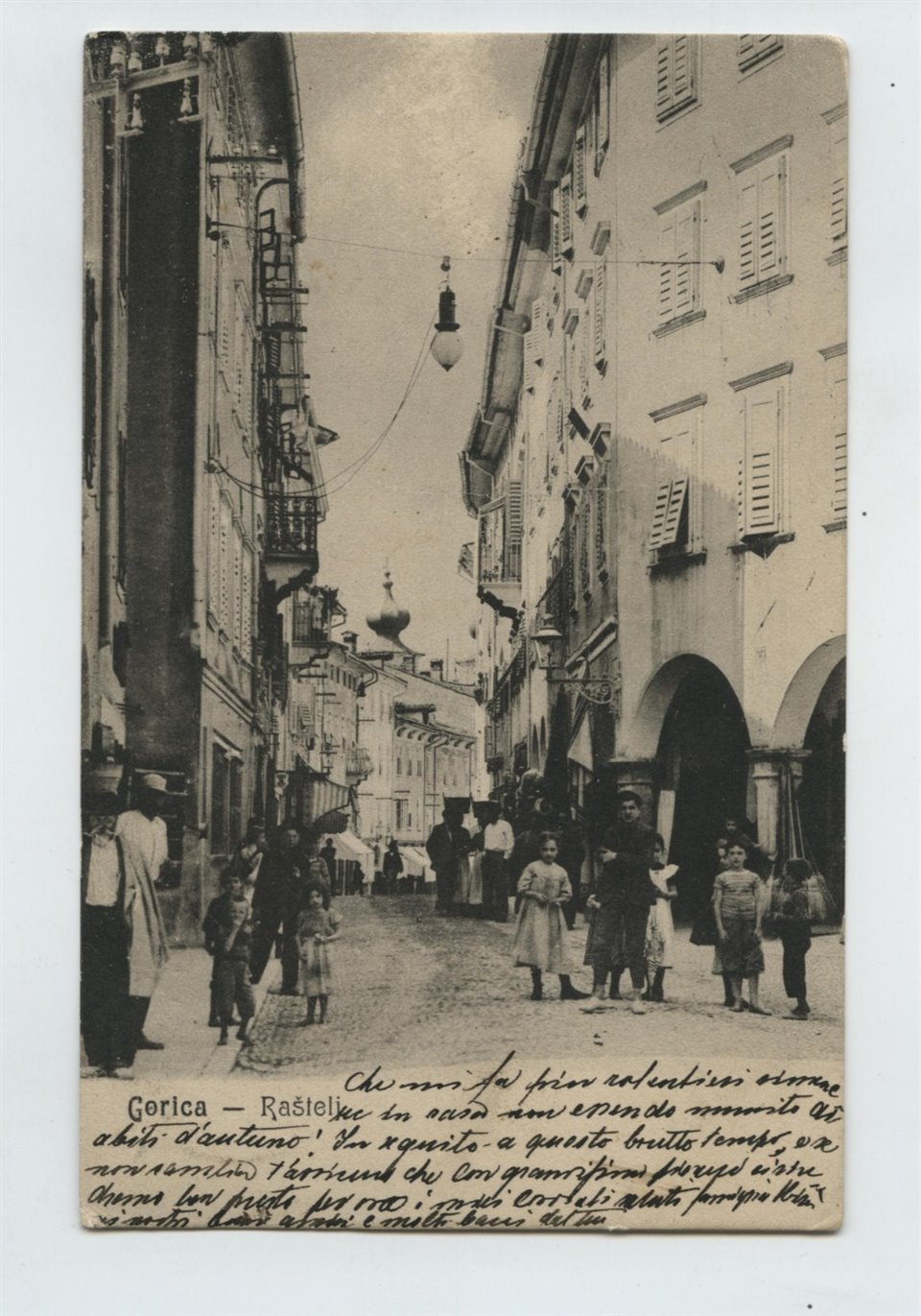 Sul veso: "S.D.M. 3356". Esemplare viaggiato il 21.05.1907. Edifici e botteghe di via Rastello verso piazza Grande (ora della Vittoria), con uomini e bambini in posa. |