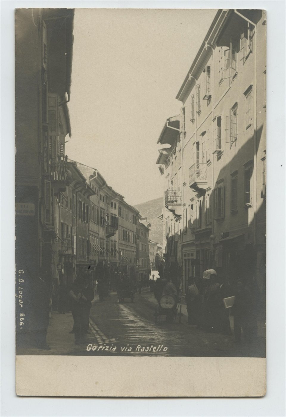 Sul recto: "G. B. Logar 866". Cartolina non viaggiata. La ripresa fotografica, realizzata dove si innesta via delle Monache, è precedente all'apertura di via Rastello al transito del tram nel febbraio del 1909 e al rifacimento Liberty di casa Sticsa a destra (1909). |