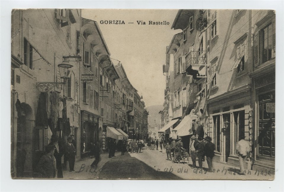 | NOTE | Sul verso: "[logo]SDM Modiano Trieste"; "7377". Cartolina viaggiata; francobollo asportato. Il testo è datato 11.11.1914. Via Rastello vista all'incrocio di via delle Monache verso piazza Grande (ora della Vittoria). Lo scatto è precedente il 1909. In quell'anno veniva completata la ristrutturazione della casa Sticsa (poi negozio Krainer) che cambierà la facciata dei primi due edifici visibili da destra. |