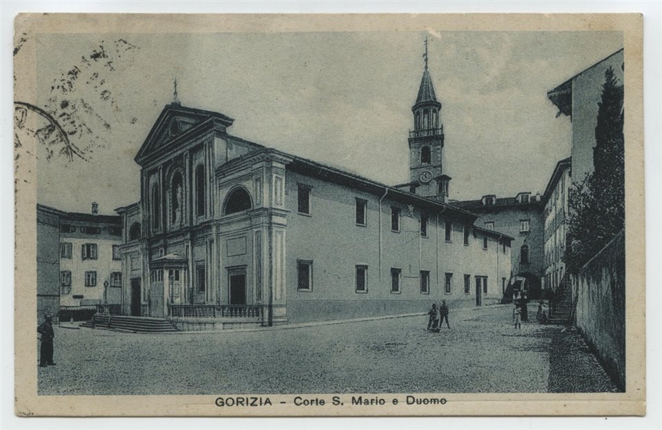 Sul verso: "Ediz. Cartoleria A. Pertot - Gorizia"; "De A. M. 32994". Cartolina viaggiata il 14.09.1926. Riedizione di una cartolina precedente la prima guerra mondiale (cfr. inv. 098). L'edizione di Pertot (con un errore di stampa nel toponimo) si colloca nel periodo in cui la ricostruzione del Duomo, gravemente danneggiato nel conflitto, non era stata ancora completata.