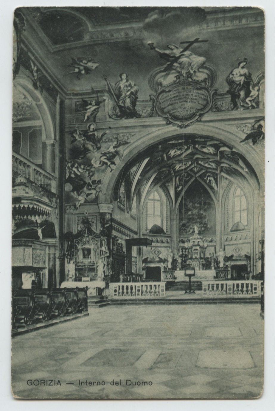 Sul verso: "[logo] SMD Modiano Trieste 7580". Cartolina viaggiata. Interno del Duomo prima della Grande Guerra, con il presbiterio e parte della navata centrale affrescata da Giulio Quaglio (1668-1751) nel 1702.