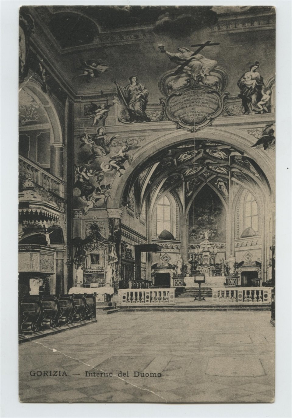 Sul verso: "[logo] SDM Modiano Trieste 7383". Cartolina non viaggiata. Interno del Duomo prima della prima guerra mondiale, con il presbiterio e parte della navata centrale affrescata da Giulio Quaglio nel 1702.