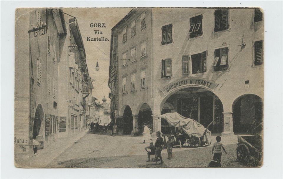 portici|Insegna drogheria N. Frantz| carretto|uomo|donna|bambino |