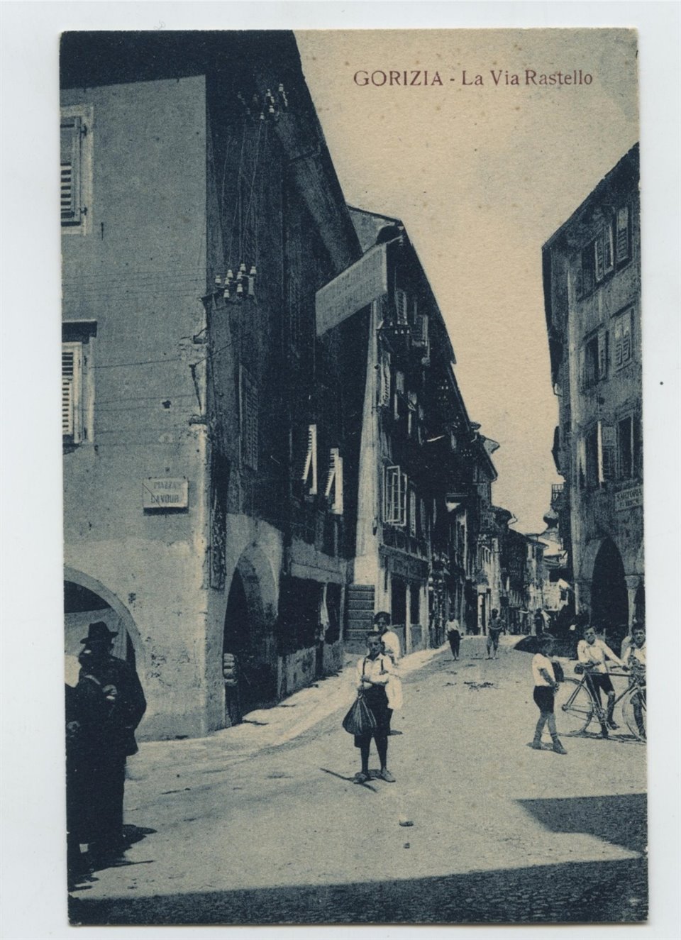 Sul verso: "Edizioni E.W.G. 1923"; "30903 [logo] MS" dello stabilimento Marzari di Schio. Cartolina non viaggiata. Sull'edificio a destra è leggibile un cartello che indica la presenza di una sartoria. Nei primi anni Venti è documentata al n. 39 di via Rastello la sartoria per uomo di Emanuele Baiocchi. |