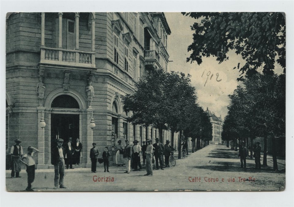 | NOTE | Sul verso: "W.L.Bp. 27 720 f". Cartolina viaggiata nel 1912. Il caffè al Corso (poi Caffè Garibaldi) era all'angolo tra via Tre Re (oggi viale XXIV Maggio) e corso Francesco Giuseppe (ora Corso Italia); in fondo si scorge il palazzo del Tribunale. |