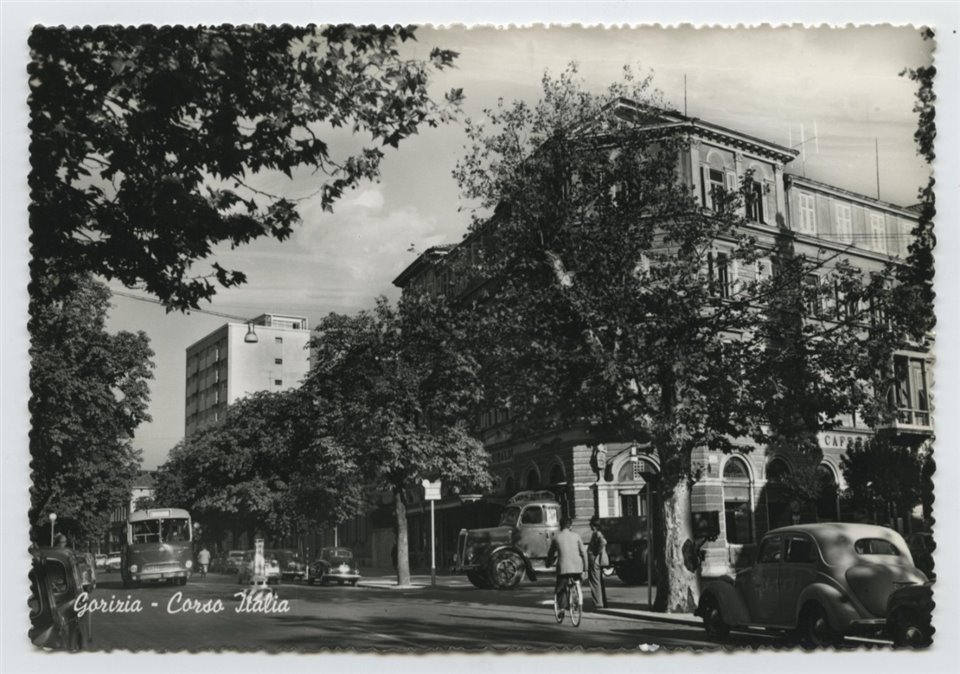 | NOTE | Sul verso: titolo parallelo "Gorizia Italien Allee/ Italy Avenue/ Boulevard Italie"; "Prop. Ris: A. Cadel - Trieste "; "Vera fotografia"; "85". Esemplare non viaggiato. Bordo fustellato. Il negativo originale su vetro è conservato presso la Fototeca del Consorzio Culturale del Monfalconese (Ronchi dei Legionari). L'alto condominio all'inizio del corso consente di datare lo scatto successivamente al 1956. |