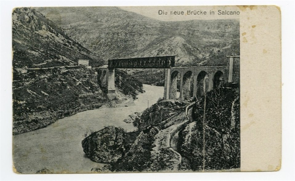 | NOTE | Sul verso: "Verlag Anton Pertot, Kunstkartengeschäft Görz, N. 91 a F"; "F65". Cartolina non viaggiata. Versione in b/n di inv. 01916. Il ponte ferroviario di Salcano venne fatto saltare l'08.08.1916 dagli Austriaci che lo resero nuovamente agibile nel maggio del 1918 grazie alla costruzione di una travata metallica. |