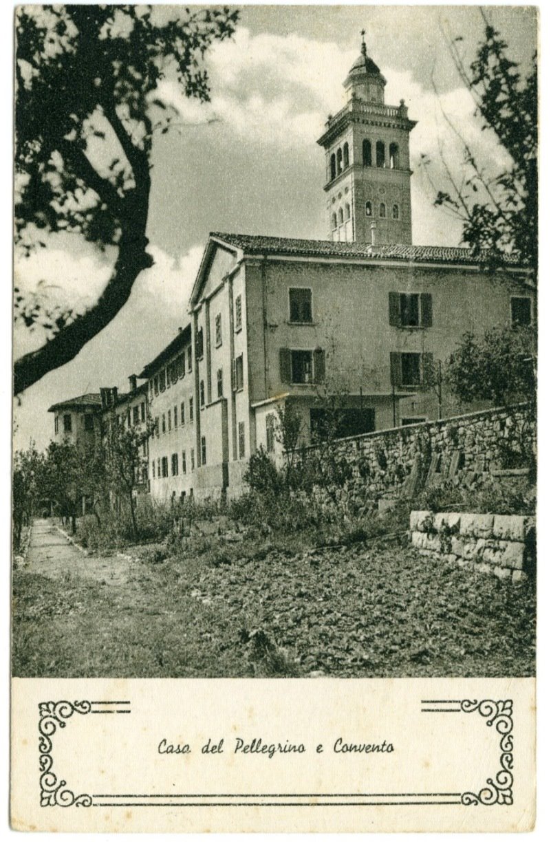 Sul verso: "Saluti dal Santuario di Monte Santo - Gorizia"; "[logo] Edizioni Marconi Genova"; "9-42-XX"; "Rip. Viet. R.D.L. 7.XI.1925-N-1950". Cartolina non viagggiata. Al termine dei lavori di ricostuzione della chiesa del santuario (1928), la cappella e il convento provvisori (cfr. inv 02726) servirono all'accoglienza dei pellegrini. |