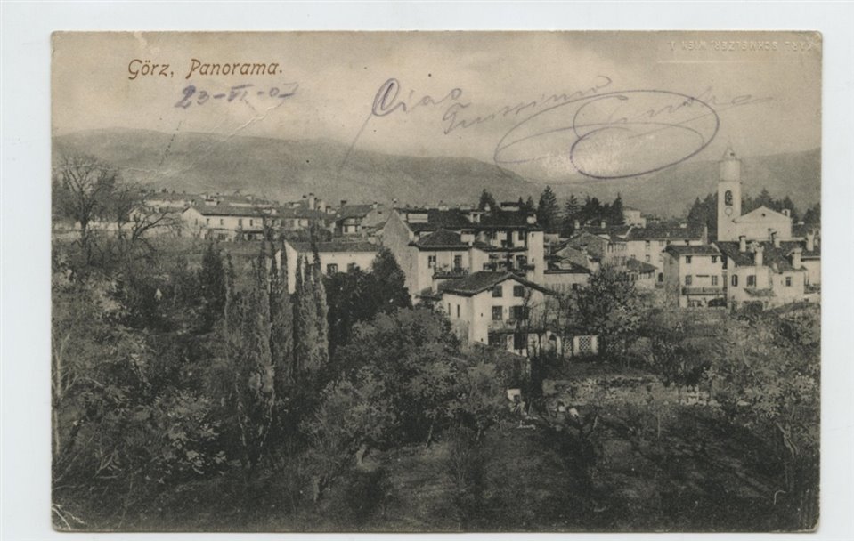 | NOTE | Sul verso: "Verlag . B.K.S.W.I."; marchio impresso: "Karl Schmelzer, Wien I." Francobollo asportato. Sullo sfondo la chiesa di san Giovanni Battista; in primo piano il verde del parco Coronini Cronberg. |