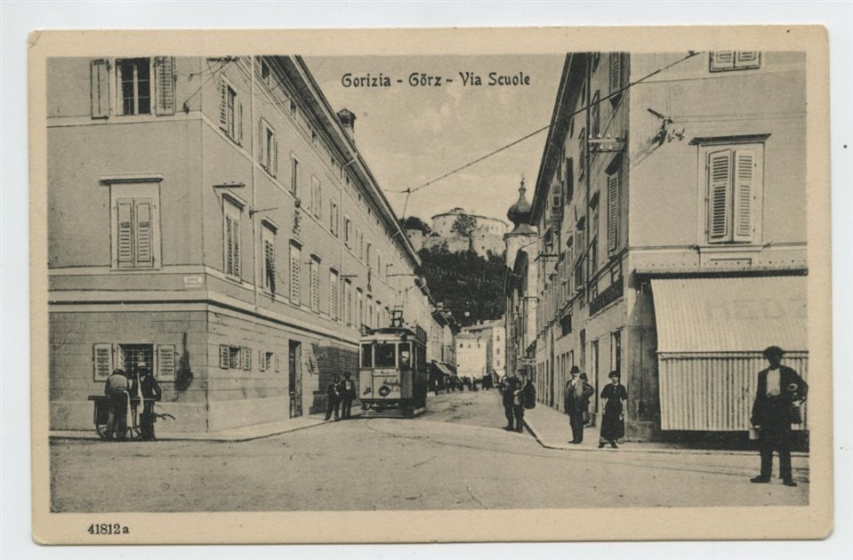 | NOTE | Sul recto: "41812a". Sul verso: "Stengel & Co., G. m. b. H.., Dresden"; [logo] Stengel"; "h G". Cartolina non viaggiata. La presenza del tram elettrico, che entrò in circolazione a Gorizia nel 1909, costituisce il termine post quem per la datazione dell'immagine dell'allora via delle Scuole. |