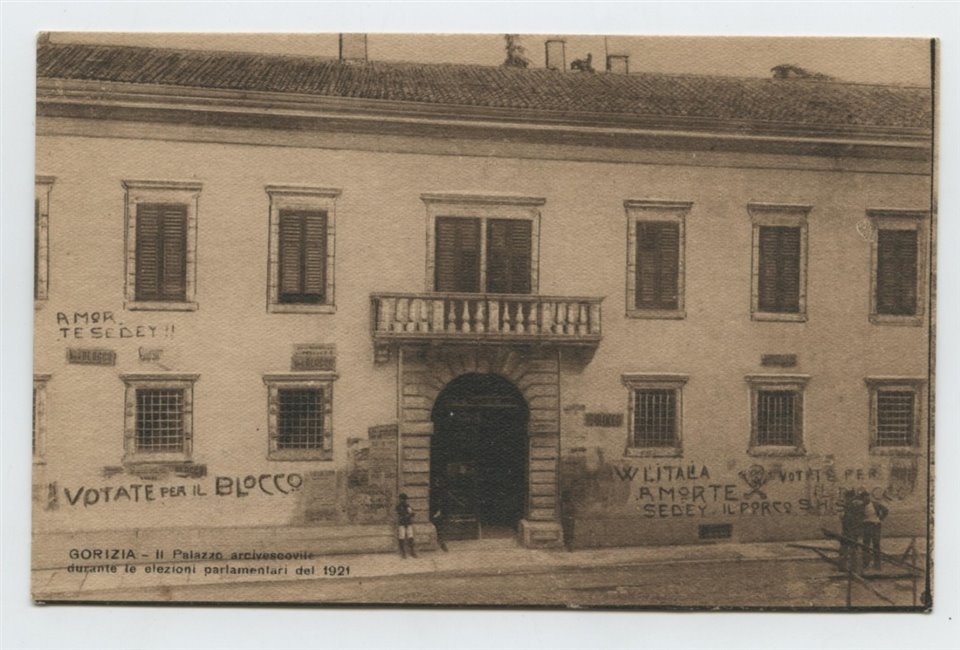 | NOTE | Sul verso: "n. 5 - Industria Cartoline e Cartonaggi A. Pertot - Gorizia 12181". Cartolina non viaggiata. Durante la campagna elettorale del 1921 comparvero scritte oltraggiose sui muri del palazzo episcopale rivolte all'arcivescovo Francesco Borgia Sedej. |