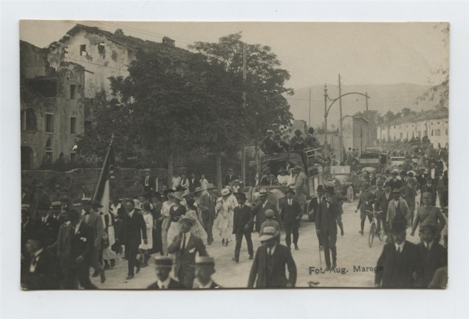 | NOTE | Sul recto: timbro "Fot. Aug. Marega". Sul verso: timbro "Vendita esclusiva Vitt. Molesini - Gorizia"; "Ubermor". Cartolina non viaggiata. Nel 1920 un'escursione nella Venezia Giulia organizzata dal T.C.I. attraverso i luoghi della guerra raggiunse Gorizia. Nella ripresa la manifestazione si snoda attraverso via Pellico provenendo da Canale, come chiarisce la didascalia della copia conservata nella Fototeca dei Musei Provinciali di Gorizia. |
