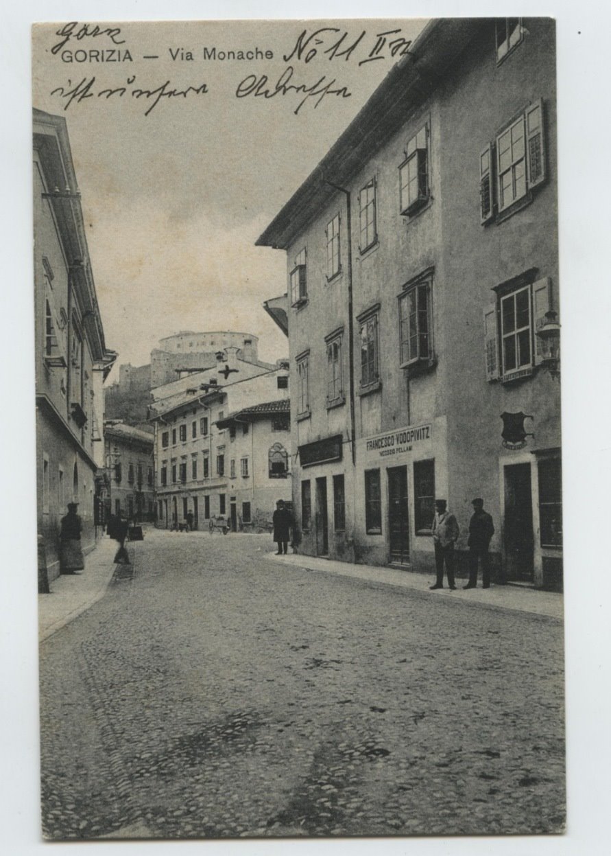 | NOTE | Sul verso: "[logo] SDM Modiano Trieste 7379". Cartolina viaggiata il 05.05.1907. La veduta riprende via delle Monache dall'ultimo tratto di via del Municipio, attuale via Mazzini, dove Francesco Vodopivitz - la cui insegna si legge sull'edificio a destra - aveva il proprio negozio di pellami. |
