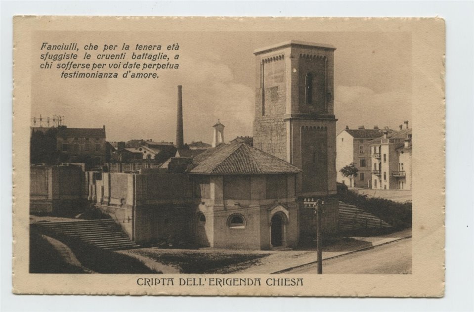 | NOTE | Sul recto: "Fanciulli, che per la tenera età/ sfuggiste le cruenti battaglie, a/ chi sofferse per voi date perpetua/ testimonianza d'amore." Sul verso: "Pro erigenda Chiesa del S. Cuore in suffragio dei caduti in guerra - Gorizia"; "035893. Cartolina non viaggiata. Margini dentellati. |