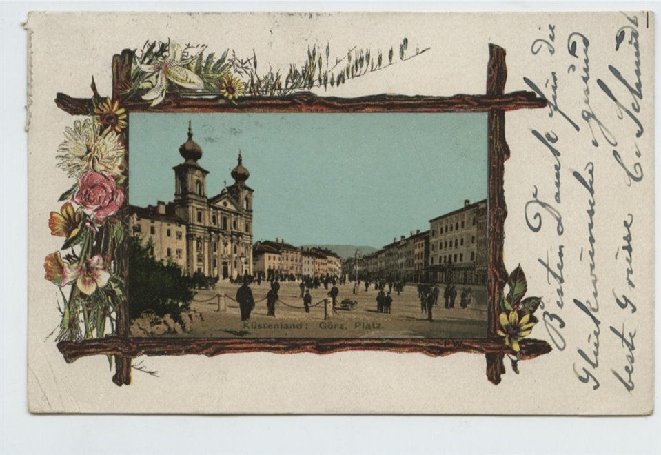 | NOTE | Sul recto: entro l'mmagine, in basso a sinistra "PM" entro un cerchio; sulla cornice "PW". Cartolina viaggiata il 07.11.1902. La veduta, uguale a quella di inv. 01025, è incollata sul cartoncino. Il titolo è stato corretto celando con una pecetta l'indicazione errata "Triest Piazza Grande". |