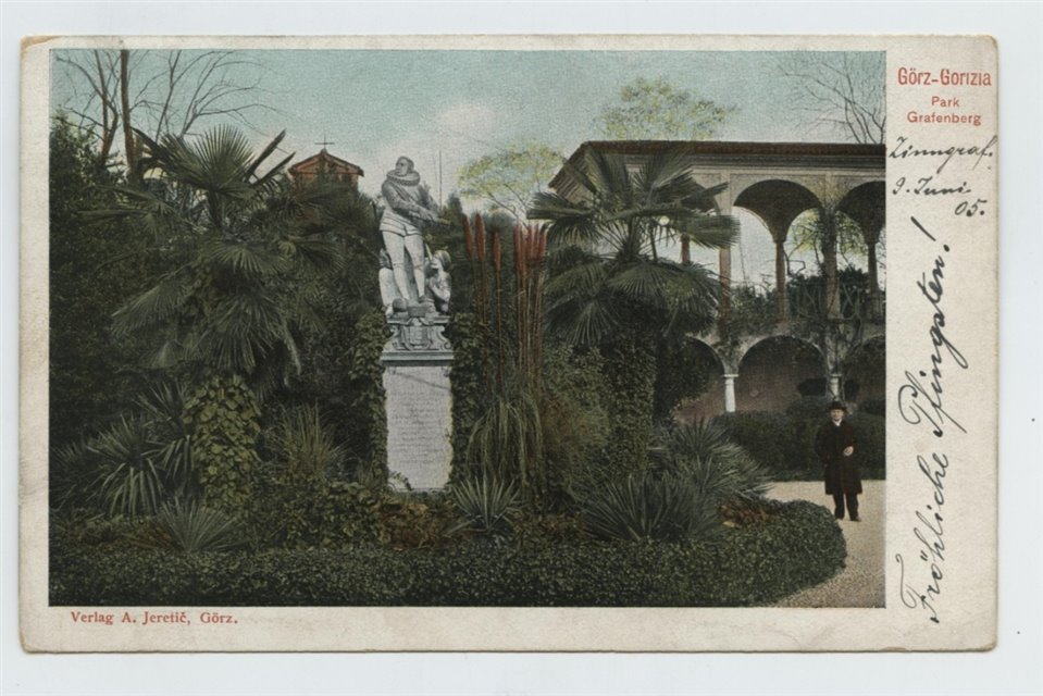 | NOTE | Sul recto: "Verlag A. Jeretič, Görz.". Cartolina viaggiata il 09.06.1905. Cartolina appartenente alla stessa serie di inv. 01071. Altro esemplare viaggiato, inv. 02959. Veduta del parco con la statua raffigurante Giovanni Battista Coronini realizzata da Marco Chiereghin (1774); sullo sfondo parte della loggia che collega la residenza alla cappella di famiglia. |