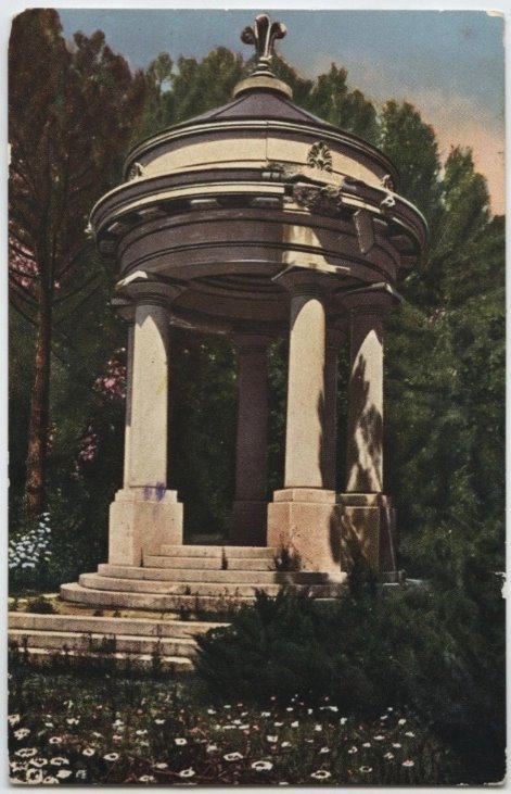 | NOTE | Sul verso: titolo; "1855". Cartolina viaggiata il 13.06.1955. L'imagine raffigura il tempietto dorico monoptero eretto nel 1914 sulla collinetta che nascondeva le cisterne di raccolta dell'acqua per l'irrigazione del parco Coronini. |