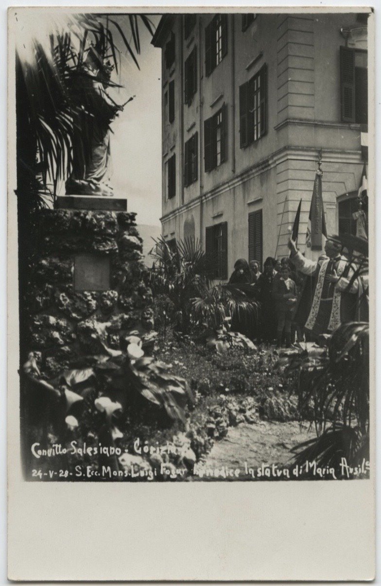 | TITOLO | Convitto Salesiano - Gorizia. 24-V-28 - S. Ecc. Mons. Luigi Fogar benedice la statua di Maria Ausil.ce |