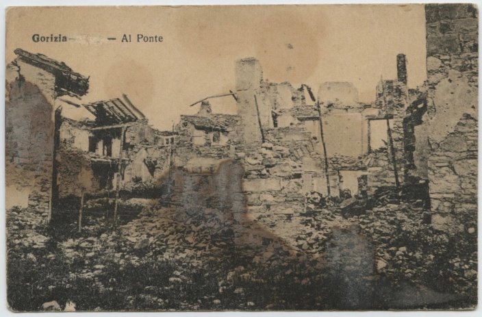 | NOTE | Sul verso: "168(..) Verlag Kartonage Fabrik Pertot Görz". Il titolo sul recto è in parte abraso. Cartolina non viaggiata. Al Ponte indicava una località in prossimità del Ponte del Torrione, alla confluenza della via Ponte Nuovo (ora viale XX Settembre) e via Ponte Isonzo (ora via Don Giovanni Bosco). |