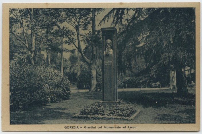 | NOTE | Sul verso: "Ed. Riva Carmela - Gorizia - Rip. Vietata - XXI"; [logo] MS"; "Ditta P. Marzari - Schio". Cartolina non viaggiata. Il busto di Graziadio Isaia Ascoli è un'opera del 1930 dello scultore Alfonso Canciani (1863-1955). |